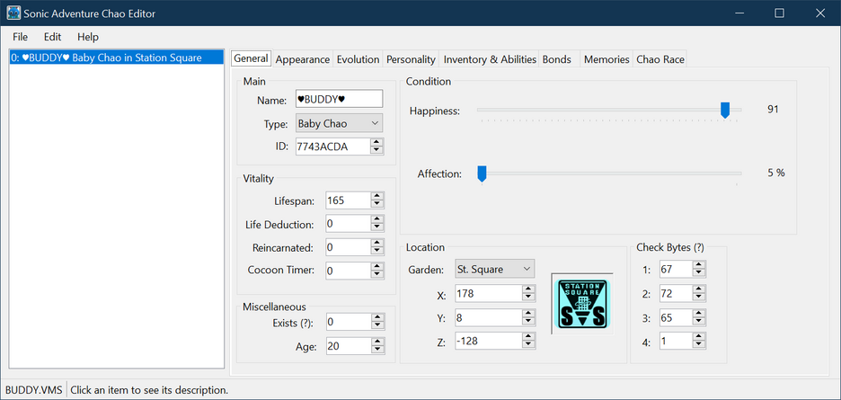 - The General tab contains general information on the Chao such as its name, type, age and happiness.