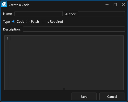 - Code: the actual code, see Writing a cheat code.