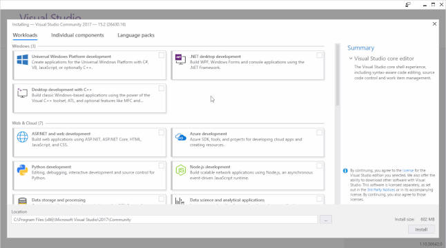 Open the installer, choose Visual Studio Community, then "Desktop Development with C++" and wait until the installation is finished.