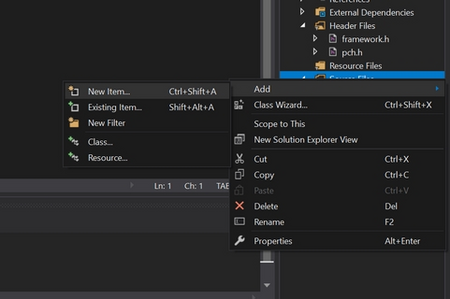 1. In Visual Studio, right click "Source Files" then click Add -> New Item...
