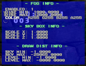 Collision objects, paths and some debug strings are visible in this mode. When this mode is enabled, you can move the character freely through any obstacles. Use the analog stick to position the character on the X and Z plane. Hold the X button to move the character up and down.