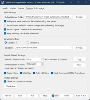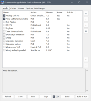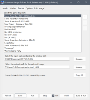 The user interface of Dreamcast Image Builder is heavily inspired by MainMemory's mod managers familiar to anyone who has modded Sonic Adventure DX, Sonic Adventure 2, Sonic R etc.