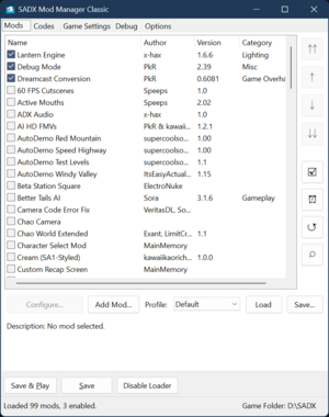 There is an alternative Mod Manager maintained by PkR. This Mod Manager is a direct continuation of the now retired SADX Mod Manager. It only supports SADX, is only available in English and does not have themes. However, unlike SA Mod Manager it can run on Windows XP.
