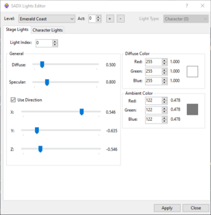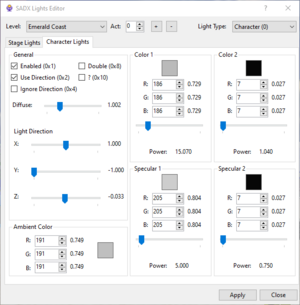 Diffusevalue has no effect on Character Lights. - For Station Square and the Mystic Ruins, Act 0 is Day, Act 1 is Evening and Act 2 is Night. Sky Deck Act 3 and Twinkle Park entrance area in Station Square use hardcoded lighting that cannot be edited in SALVL. Casinopolis has hardcoded light rotation. Some other levels have hardcoded ambient color or light direction overrides.