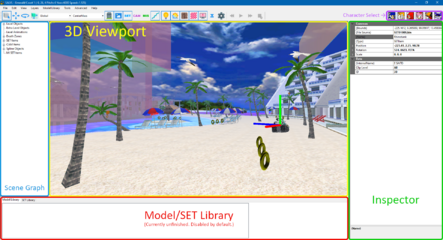 The model library (highlighted in red) is a palette that contains a series of 3d models, stored in memory until you decide to add them to the stage. You can add a model from the model library to the stage by clicking on it and dragging the icon into the 3d viewport. You can import external 3d model files (obj and sa1mdl formats supported) into the Model Library by using the File->Import->To Model Library menu option. It is currently unfinished and is disabled by default. You can enable it by unchecking View->Disable Model Library.