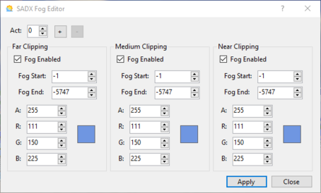 SADX PC has fog settings for each detail (clip) level. Since lower clip settings were meant for underpowered machines by 2004 standards, in the majority of cases there is no point in using anything other than High (Far). If a selected act in a stage does not have fog data, click the + button to create it (if fog data already exists, it will be overwritten with default data). To remove current fog data, click the - button. Click Apply to update fog in the main editor.