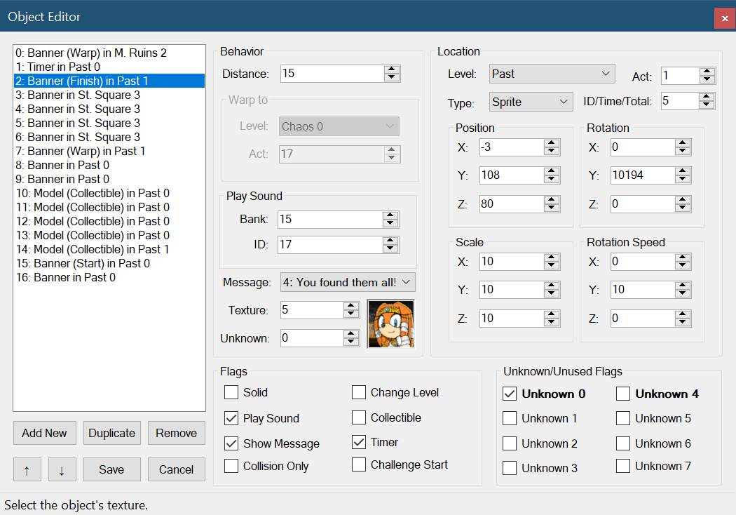 [Item 0] // Item index, increases for every next item. Level=26 // Internal ID of the level where the object will be loaded. 1-10 are Action Stages, 26 is Station Square etc. Act=3 // Act ID where the object will be loaded. ScaleX=10 // Scale of the model/sprite multiplied by 10, e.g. 10 means the object will not be scaled. ScaleY=10 ScaleZ=10 ObjectType=TYPE''MODEL // Kind of object. Can be TYPE''MODEL (3D model), TYPE''SPRITE (flat model), TYPE''INVISIBLE (no geometry). Flags=FLAG''MESSAGE, FLAG''WARP // Object flags. MessageID=3 // ID of text string to display when you touch the object. CollectibleID=1 // IDs for collectible objects. Each collectible needs to have a different ID that ranges from 1 to the total number of objects (up to 255). TriggerRadius=20 // Distance required to trigger the object's action. TextureID=1 // Force the model's material to a specific texture ID, useful for billboards but can work with 3D models too. WarpLevelOrSoundbank=35 // Level ID to warp to or soundbank ID to play the sound when the object is triggered. WarpActOrSoundID=2 // Act ID to warp to or sound ID to play when the object is triggered. RotSpeedX=0 // Rotation speed. RotSpeedY=10 RotSpeedZ=0 RotationX=49152 // Object rotation. RotationY=4000 RotationZ=0 X=698 // Object position. Y=0 Z=1600