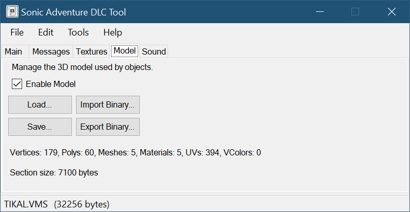 The DLC can store a single Ninja Basic model. You can add a model in SAModel's .sa1mdl format using the Load... button, or import a model from another DLC's extracted data (PRS or BIN file) using the Import Binary... button. The tool manages model data automatically. If you use a model in .sa1mdl format, you don't need to create a PRS file.